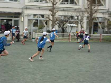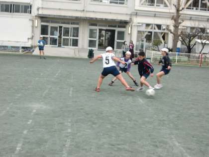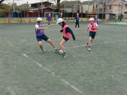 サッカーの学習です。インサイドキックを使ってボールを上手にコントロールできているか、チーム内で声を掛け合っているか、自分のチームの課題を解決しようとしているかなどのポイントに気をつけてプレーしています。