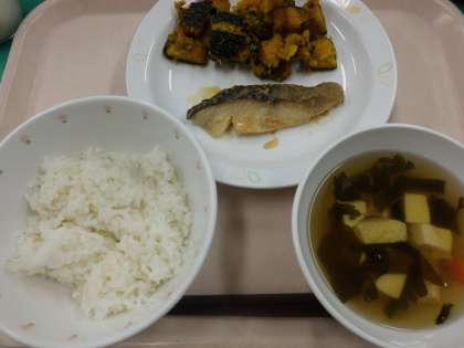 ごはん・牛乳・魚のピリ辛ソースかけ・かぼちゃの大学芋風・すまし汁