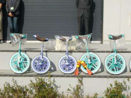 続いてPTA会長から、みんなが集めたベルマークで購入した一輪車とスカッドボーイの紹介がありました。大切に使いましょう!