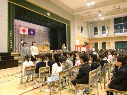 136名の新1年生が千歳小学校の仲間入りです。校長先生からはパペットを使って名前を呼ばれたら返事をしっかりしようというお話がありました。4クラス5人の担任の先生の紹介がありました。