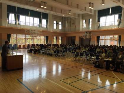 体育館で全体会を行いました。新しい教職員の紹介のあと校長から学校経営方針の話がありました。