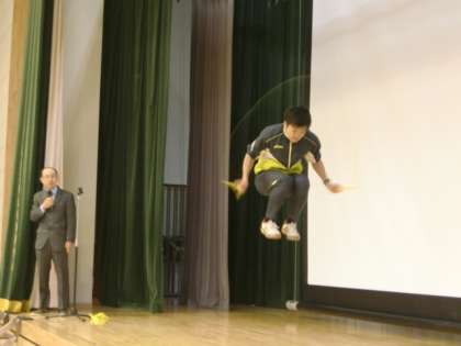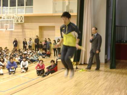 いよいよH先生による五重跳びの披露です。体育館いっぱいに歓声があがりました。