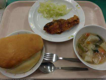 ミルクパン・牛乳・魚のフライ・ゆでキャベツ・ワンタンスープ