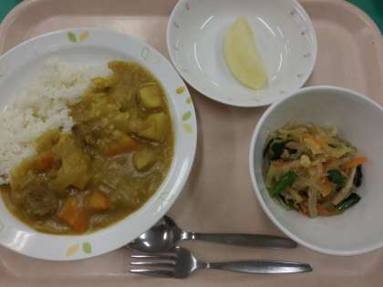 カレーライス・牛乳・小松菜サラダ・くだもの