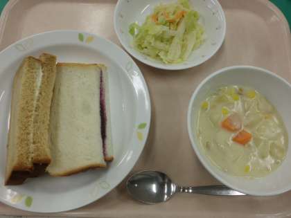 二色サンド・牛乳・コーンシチュー・キャベツサラダ