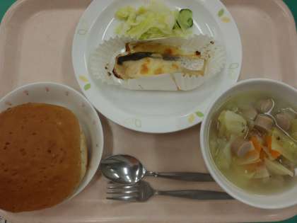 セサミパン・牛乳・魚のチーズ焼き・ポトフ・ひと塩野菜