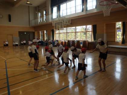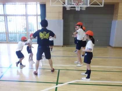 6年生の大きな動きをまねしようと、1年生もがんばっています。