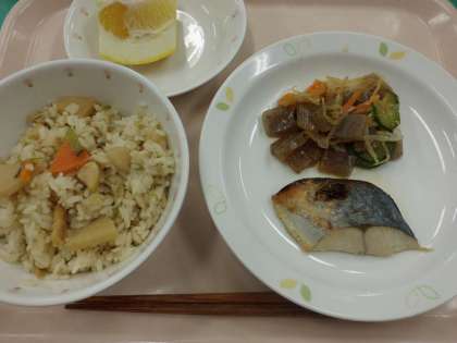 たけのこごはん・牛乳・魚の西京焼き・こんにゃくサラダ・くだもの