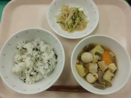 わかめとじゃこのごはん・牛乳・春野菜のうま煮・ごま酢かけ