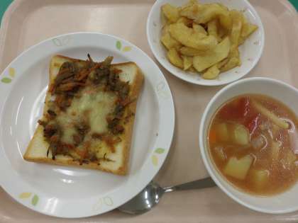 きんぴらトースト・牛乳・ミネストローネ・スパイシーポテト