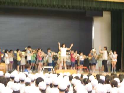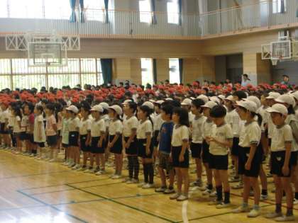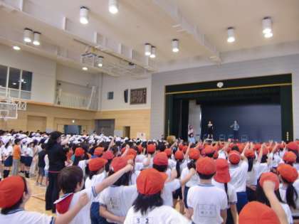 運動会で歌う歌三曲の練習をしました。「われら千歳っ子」と校歌は音楽委員の指揮と吹奏楽団の伴奏で歌います。「ゴーゴーゴー」は応援団長のリードで和太鼓に合わせて歌います。元気な声が体育館いっぱいに響きました。