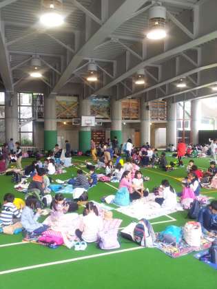 体育館で昼食。みんな楽しそう。外が明るくなってきました。