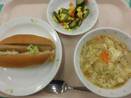 ウインナーサンド・牛乳・卵スープ・トロピカルサラダ