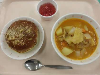 焼きカレーパン・牛乳・ボルシチ・あじさいゼリー