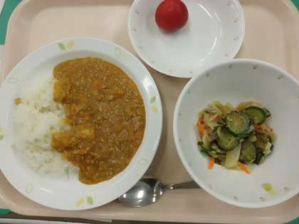 キーマカレーライス・牛乳・わかめサラダ・くだもの