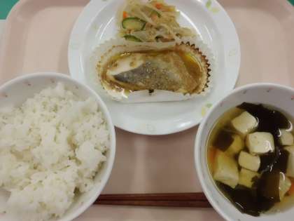 ごはん・魚のごまネーズ焼き・こんにゃくサラダ・すまし汁