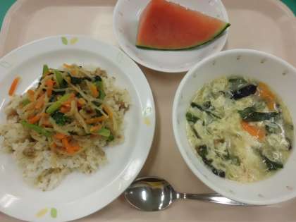 ビビンバ・牛乳・にらたまスープ・くだもの