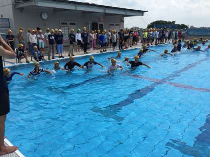 水泳記録会に続いて、着衣泳を行いました。川や海なとで、水の事故に遭わないように、着衣泳を体験しておくのはとても大切なことです。