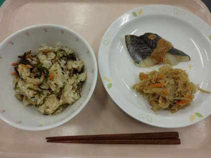 磯おこわ・牛乳・魚のピリ辛ソース・切り干し大根の煮つけ