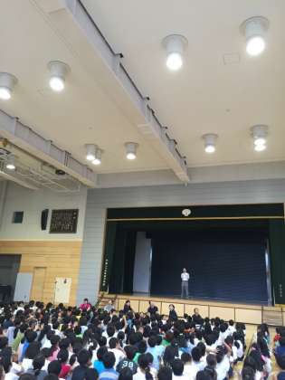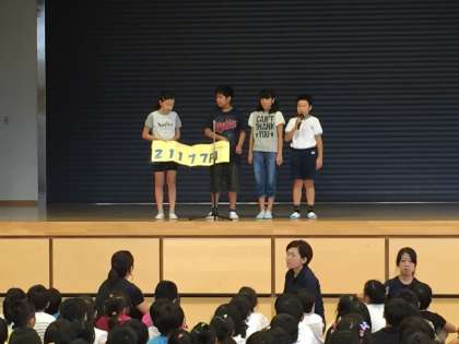校長先生のお話は体育館の天井の工事で何が変わったかについてでした。ボランティア国際委員会からはユニセフ募金の報告がありました。大震災があったネパールに送られるそうです。