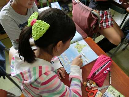 地図を見ながら、魚が家に届くまでの流れを確認しています。地図を見るのは、とても楽しそうです。