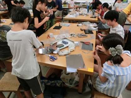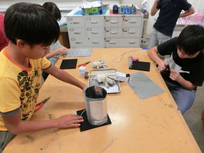 金属を使ったオブジェ作りです。針金や網を使った作業をしています。子どもたちに話を聞くと、様々なイメージがあるようで、完成するのが楽しみです。