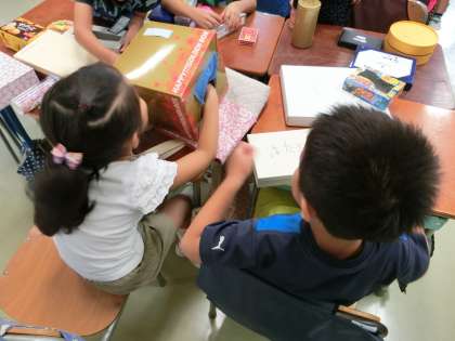 2組の授業では、ブラックボックスに箱を入れて、手でさわって、何の形が当てるという活動をしています。丸いのか、角があるのか、楽しみながら活動に取り組んでいます。