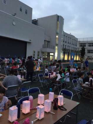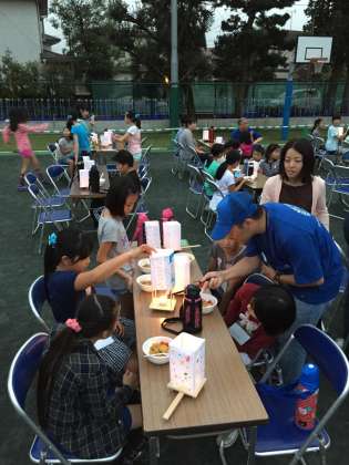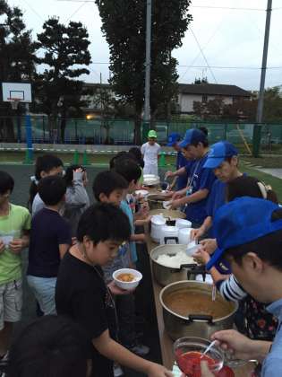 校庭で夕飯のカレーライスとフルーツボンチを食べました。