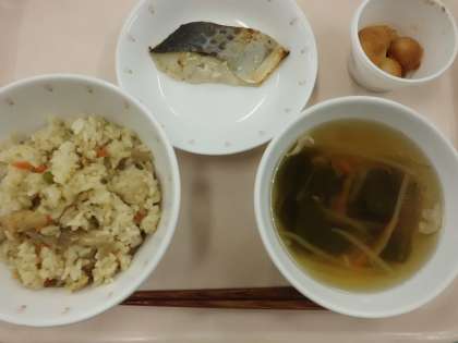 きのこごはん・牛乳・魚の西京焼き・沢煮椀・月見だんご