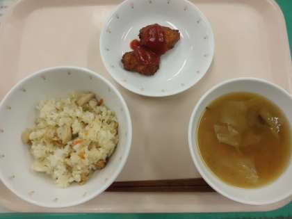 こぎつねごはん・牛乳・豆腐のナゲット・きゃべつとえのきのみそ汁