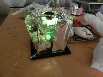 作品完成間近。ライトをつけて出来を確認して、修正を加えています。