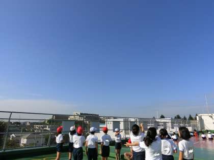 6年生の理科は、月についての学習です。朝見える月が、どの方向にどの高さで出ているかを観察しています。天気が良くてよかったです!