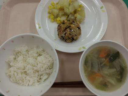ごはん・牛乳・和風ひじきハンバーグ・コーンポテト・野菜スープ