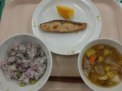 枝豆ゆかりごはん・牛乳・魚のしょうが風味焼き・さつま汁・くだもの