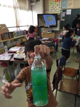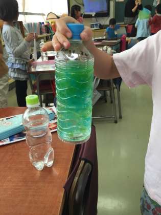 ペットボトルドームを作ろう。色紙を2種類、ペットボトルの水の中へ。ふるとどうなるか?