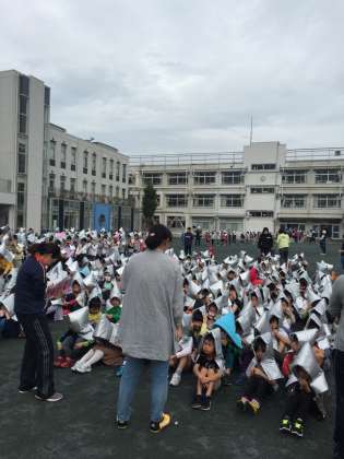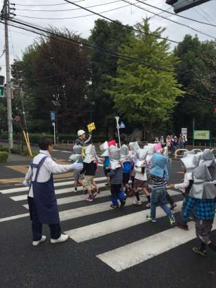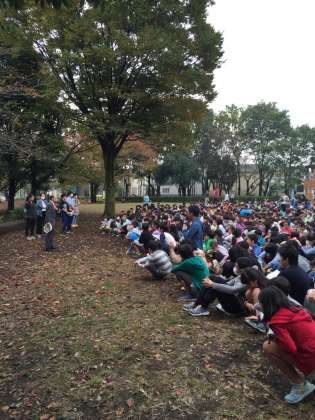 今日は家庭科室から出火し、初期消火に失敗したという想定で、祖師谷公園に二次避難しました。安全に気をつけて、出火から20分で避難完了しました。