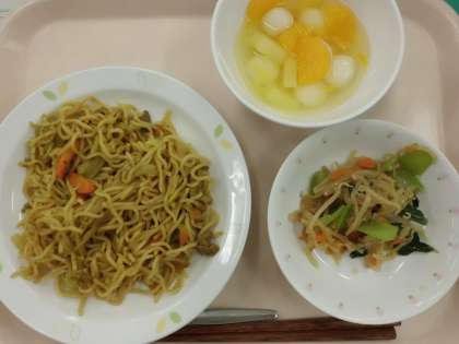 カレー焼きそば・牛乳・ナムル・フルーツ白玉
