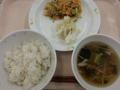 ごはん・牛乳・えびと豆腐のシュウマイ・炒合菜・しめじのスープ