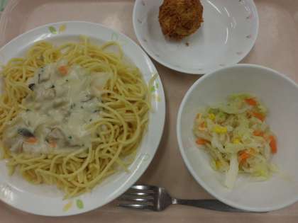きのことベーコンのクリームスパゲティ・牛乳・コーンサラダ・いが栗ぼうや
