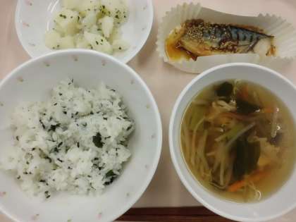 わかめごはん・牛乳・さばの一味焼き・粉ふきいも・沢煮椀