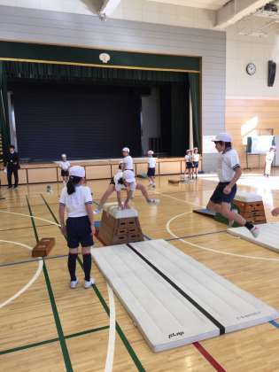 今年度6回目の研究授業は跳び箱運動。開脚跳びだけでなく、かかえこみ跳びにもチャレンジしました。様々な場の工夫が凝らされた授業でした。