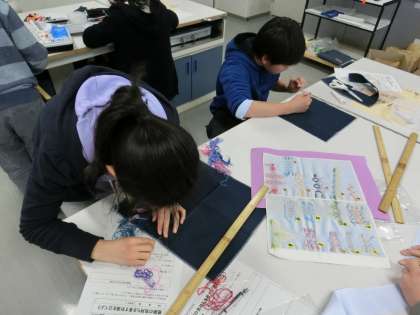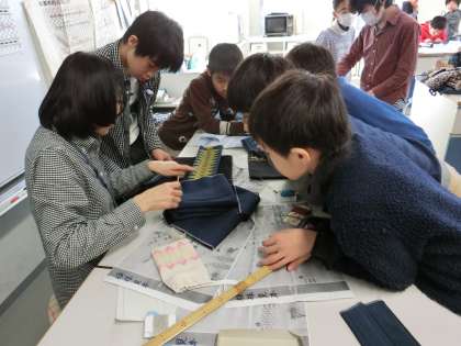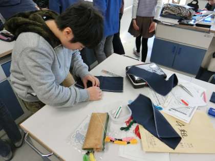 スウェーデン刺繍です。男子の多くが先生の周りに集まってお手本を見ています。