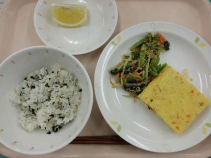 わかめごはん・牛乳・擬製豆腐・ごまあえ・くだもの
