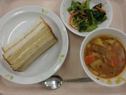 二色サンド・牛乳・ビーンズシチュー・小松菜サラダ