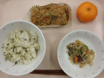 高菜ごはん・牛乳・生揚げそぼろあんかけ・こんにゃくサラダ・くだもの