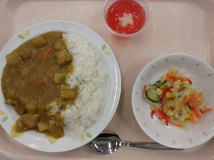 カレーライス・牛乳・トロピカルサラダ・クランベリーゼリー
