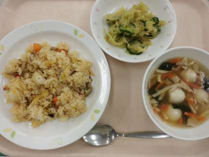 キムチチャーハン・牛乳・野菜の中華あえ・春雨スープ