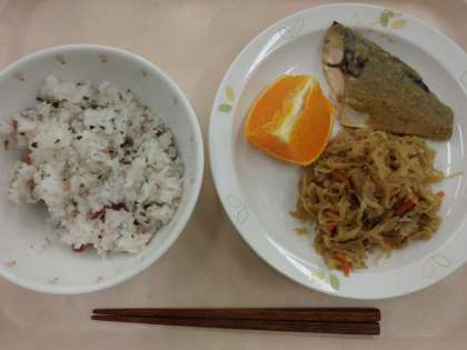 梅わかごはん・牛乳・さばのごまだれかけ・切り干し大根の煮つけ・くだもの