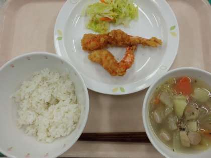 ごはん・牛乳・えびフライ・ゆで野菜・白菜とウインナーのスープ