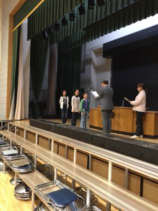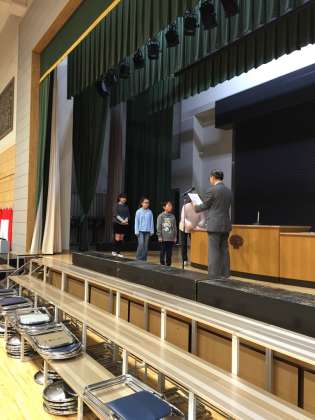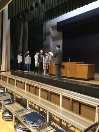 今朝は都の書きぞめ、美術展に出品された児童、ソフトテニスの大会で、優秀な成績をおさめた子どもたちの表彰をしました。